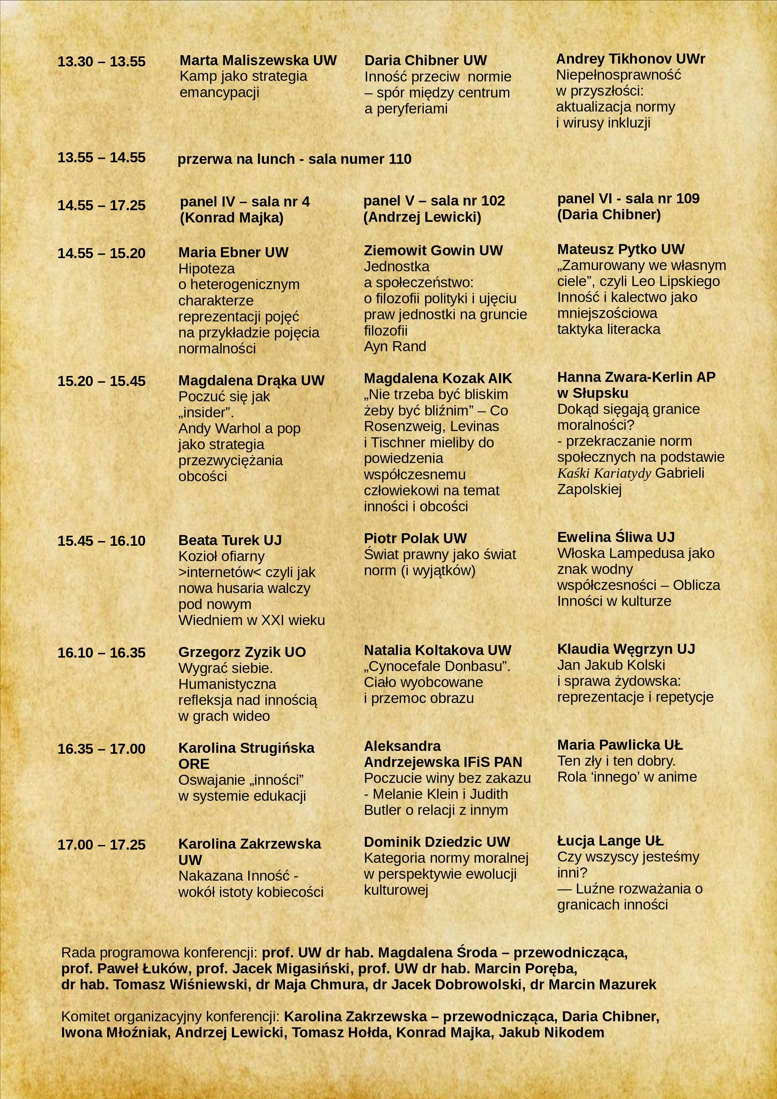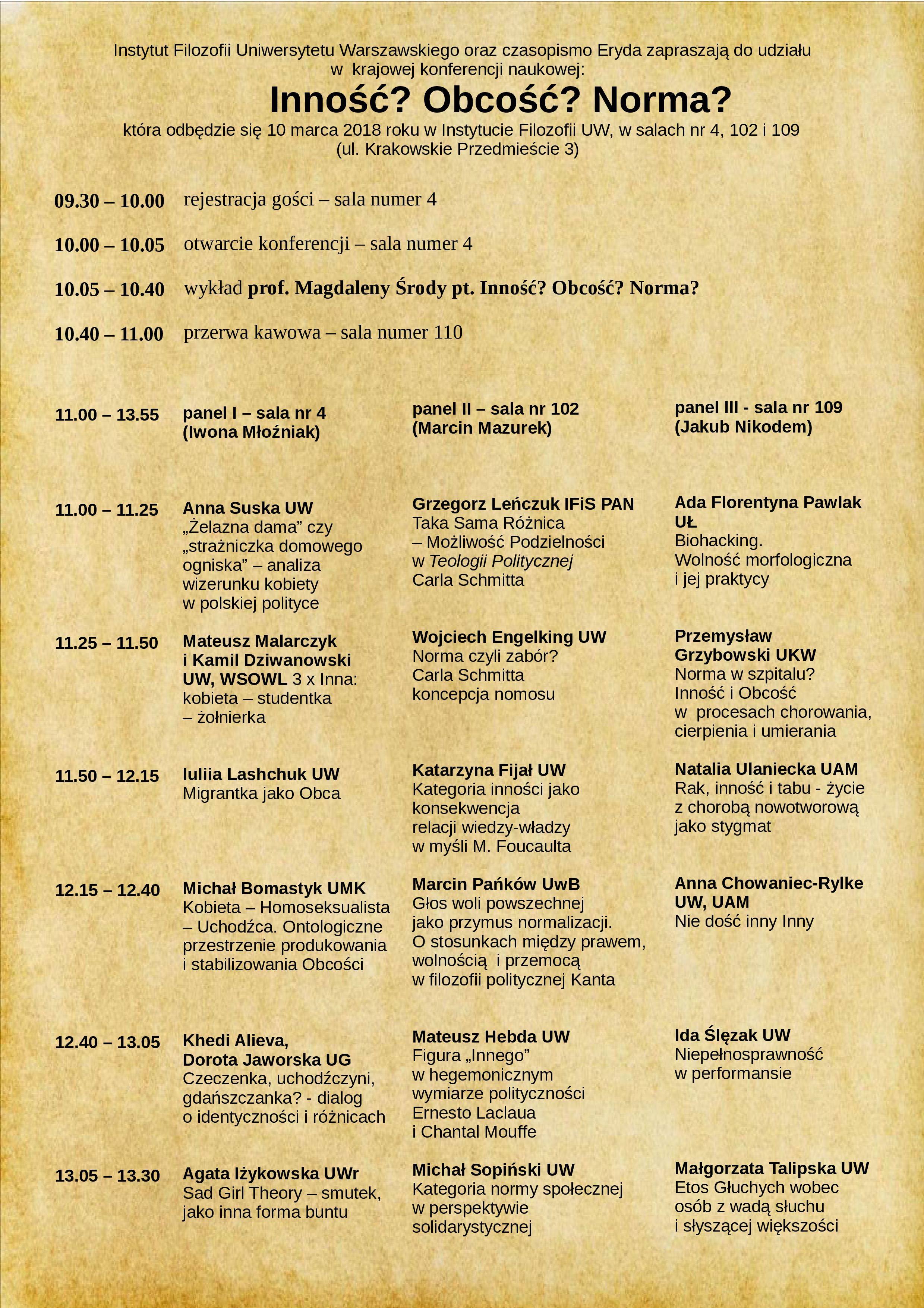 Celem konferencji był namysł zarówno nad pojęciem Inności, Obcości i Normy, jak i nad zachodzącymi między nimi relacjami. Czy Norma jest warunkiem wstępnym Inności czy Obcości, czy jest niezbędna do ich zdefiniowania? Szeroko rozpowszechnione jest przekonanie, że z jednej strony Norma wyklucza Inność, jednak z drugiej strony, nie sposób wyobrazić sobie Normy i jej granic bez jej przeciwieństwa – Inności. W związku z tym, czy można pomyśleć o Normie poza Innością i Obcością? Kategoria Inności i Obcości ma różne wymiary, zarówno społeczny, etyczny, prawny, jak i biologiczny. (więcej na stronie http://eryda.eu)